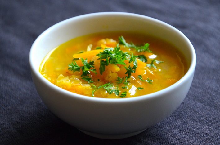 Když se mi nechce dělat se zeleninovým vývarem, jednoduše rozpustím v uvařené vodě zeleninový bujon. Používám výhradně ten v bio kvalitě, konrtétně od Alnatury. Ve velkém hrnci rozehřeju olej a máslo a dám zpěnit cibuli. Přidám mrkev, zázvor a restuju asi 5 minut. Následně přiliju vývar a jakmile se začne voda lehce vařit, přihodím propláchnutou čočku. Na červené čočce mě baví právě to, že se nemusí dlouze namáčet. Nechám vařit a probublávat na nižším ohni asi 10 minut. Nakonec osolím a těsně před podáváním přidám nasekanou petrželku. Polévku nijak nezahušťuju, díky čočce a mrkvi je hustá dost. Pokud ji chci mít ještě o něco hustší, přihodím do ní spolu s čočkou na kostičky nakrájenou bramboru.